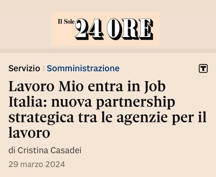 Job Italia S.p.A., Società per Azioni a capitale interamente italiano, nel corso del 2023 ha iniziato a prendere contatti con l’agenzia Lavoro Mio S.p.A., storica agenzia di somministrazione lavoro, fra le prime nel settore dell’interinale bresciano per conoscere nuovi settori di espansione e possibilità di collaborazioni. Lavoro Mio S.p.A. continuerà a fornire i servizi di somministrazione, ricerca e selezione, mantenendo la sua specifica modalità di azione e di offerta sul territorio in sinergia con il nuovo partner Job Italia S.p.A., puntando a migliorare la qualità e la capacità di rimanere al fianco delle aziende e dei lavoratori grazie ad una nuova strategia di azione combinata con il nuovo partner. Dal canto suo, con questa partnership Job Italia S.p.A. rafforzerà ulteriormente la propria presenza sul panorama nazionale.