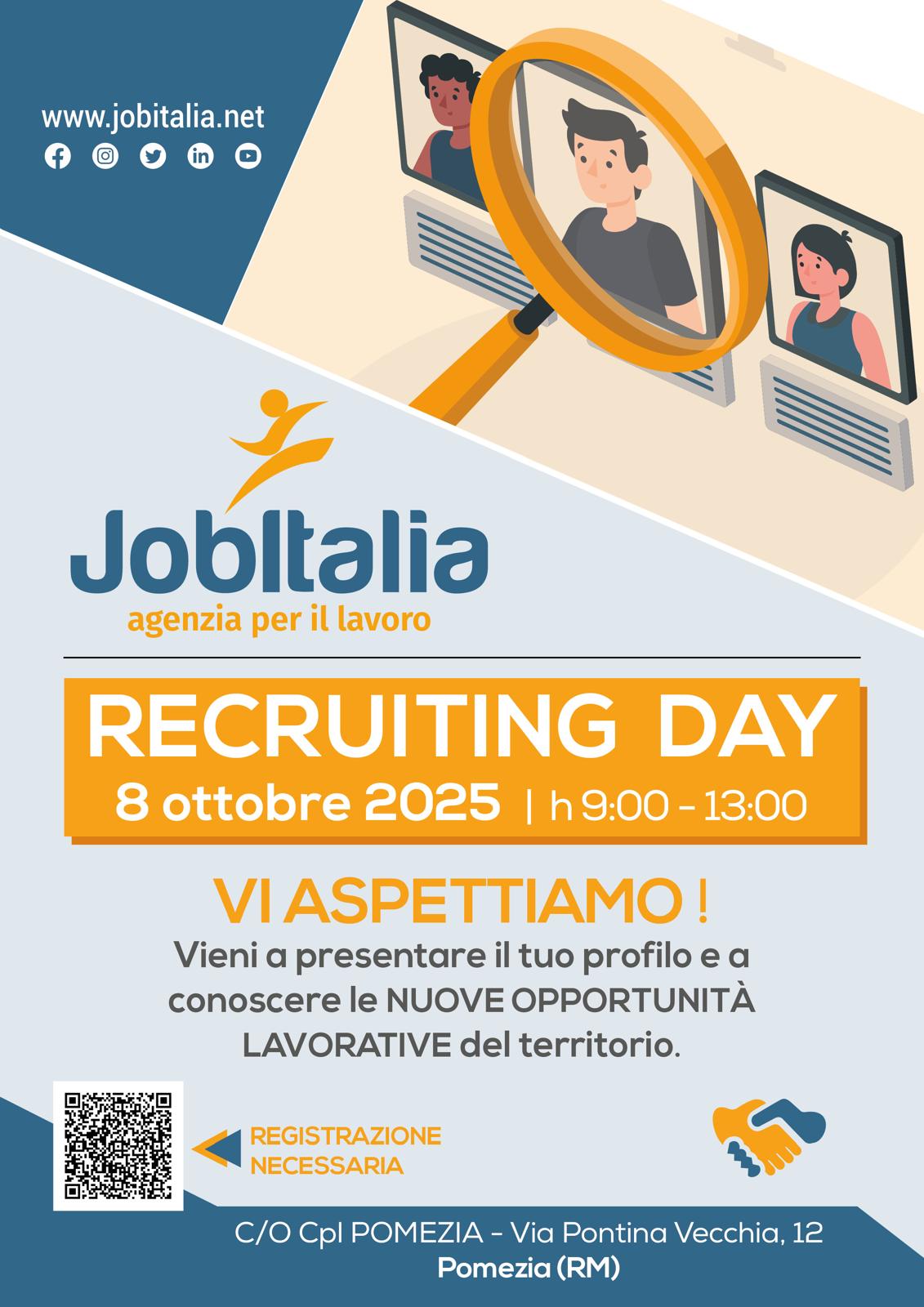 Job Italia SPA, filiale di Anzio (RM), sta organizzando un RECRUITING DAY il giorno 08/10/2025 presso CENTRO PER L’IMPIEGO in via Pontina Vecchia, 12 -Pomezia (RM) dalle ore 09:00 alle ore 13:00.