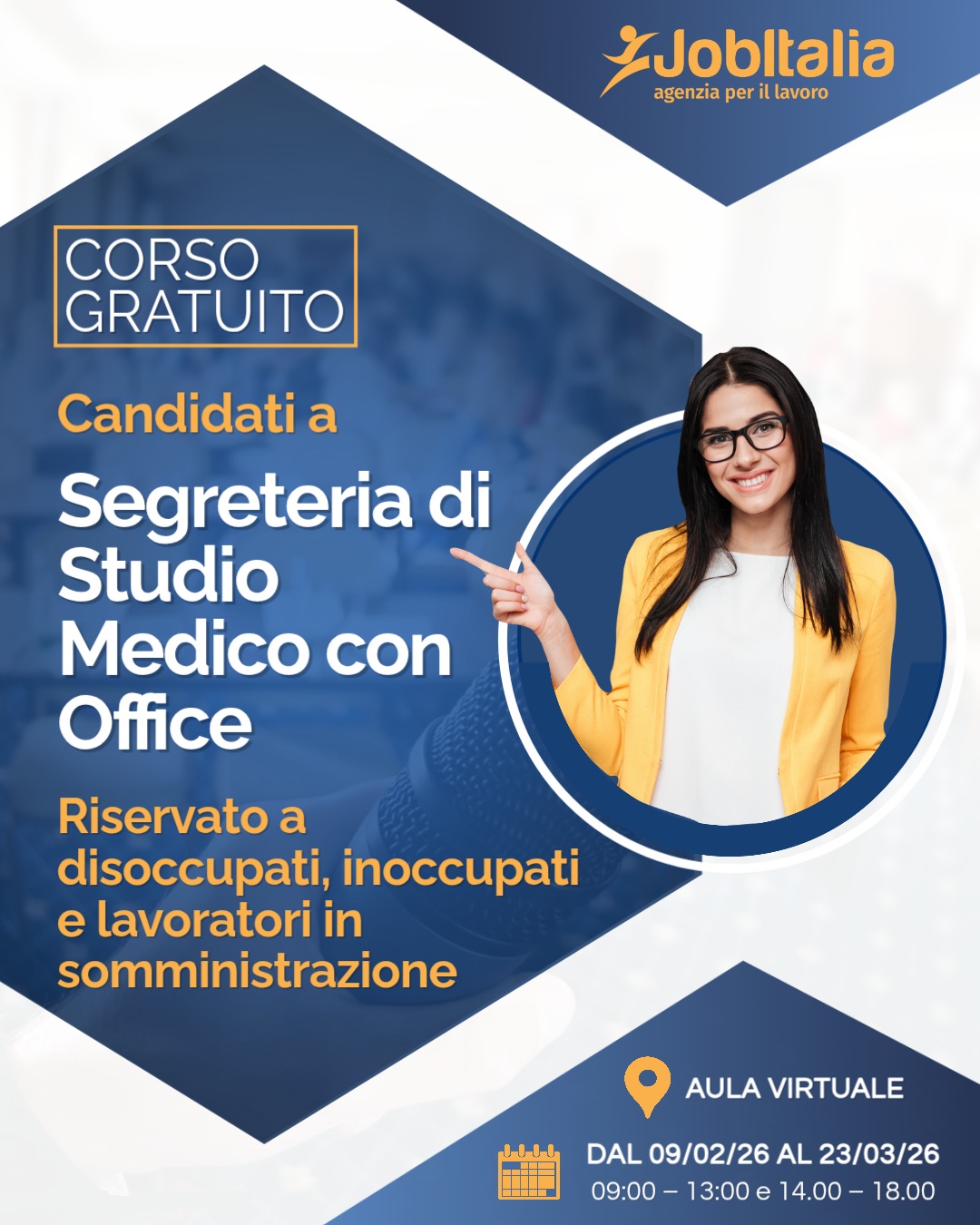Per maggiori informazioni e candidature link https://www.talentform.it/formazione-professionale/segreteria-di-studio-medico-con-office-corso-gratuito-online-full-time-id2687/?occurrence=2026-02-09